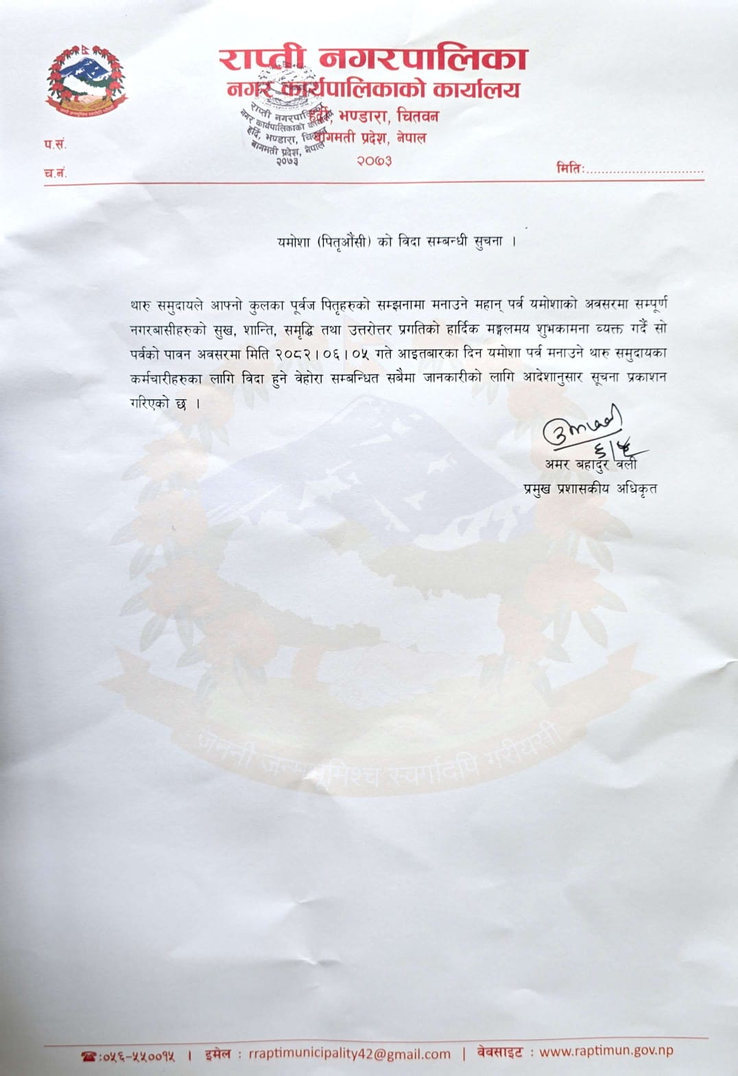 यमोसा (पितृऔंसी) को बिदा सम्बन्धी सूचना।
