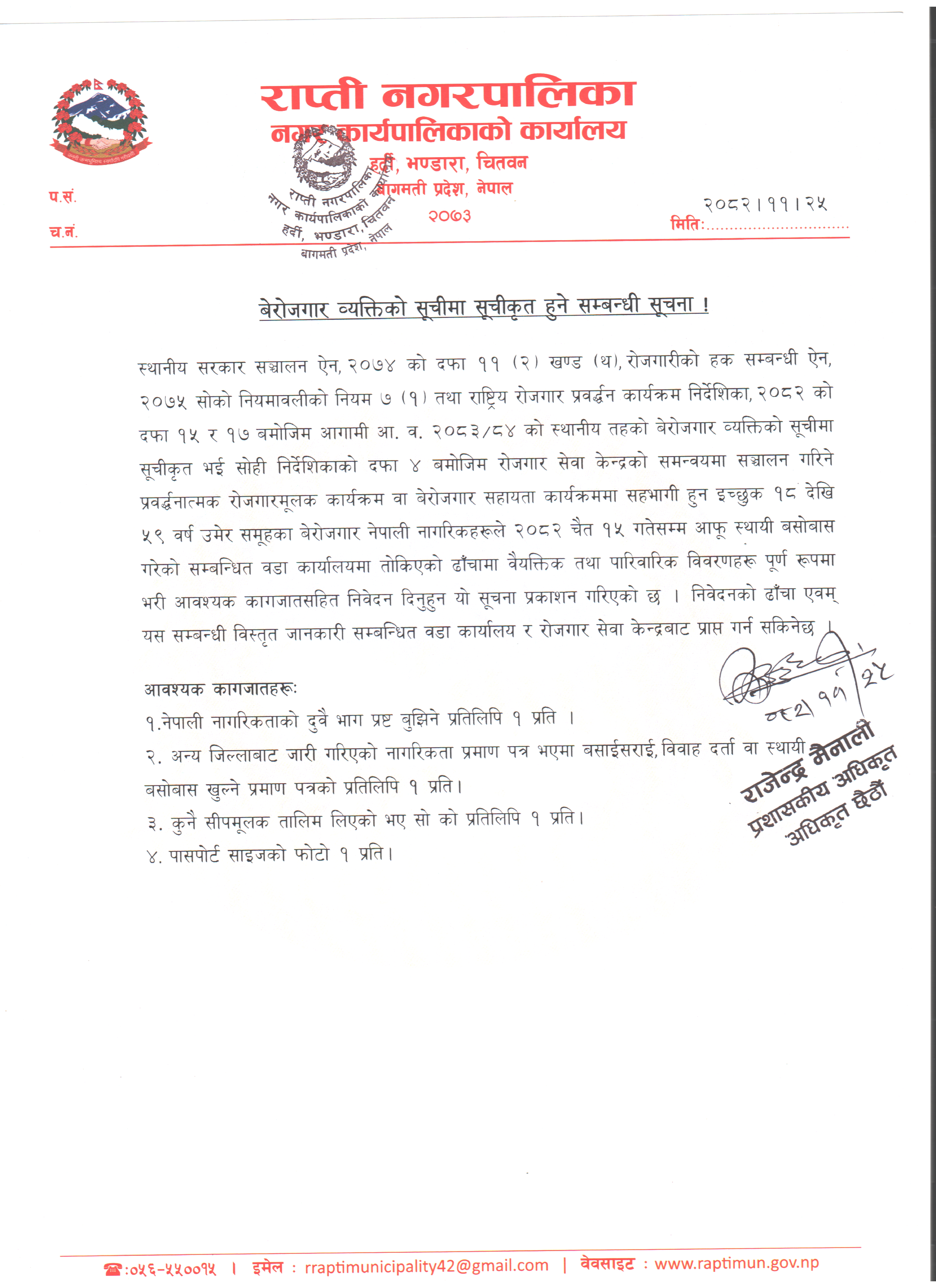 आ.व. २०८२/०८३ को लागि न्यूनतम रोजगारीमा संलग्न हुन निवेदन दिने सम्बन्धी सूचना ।